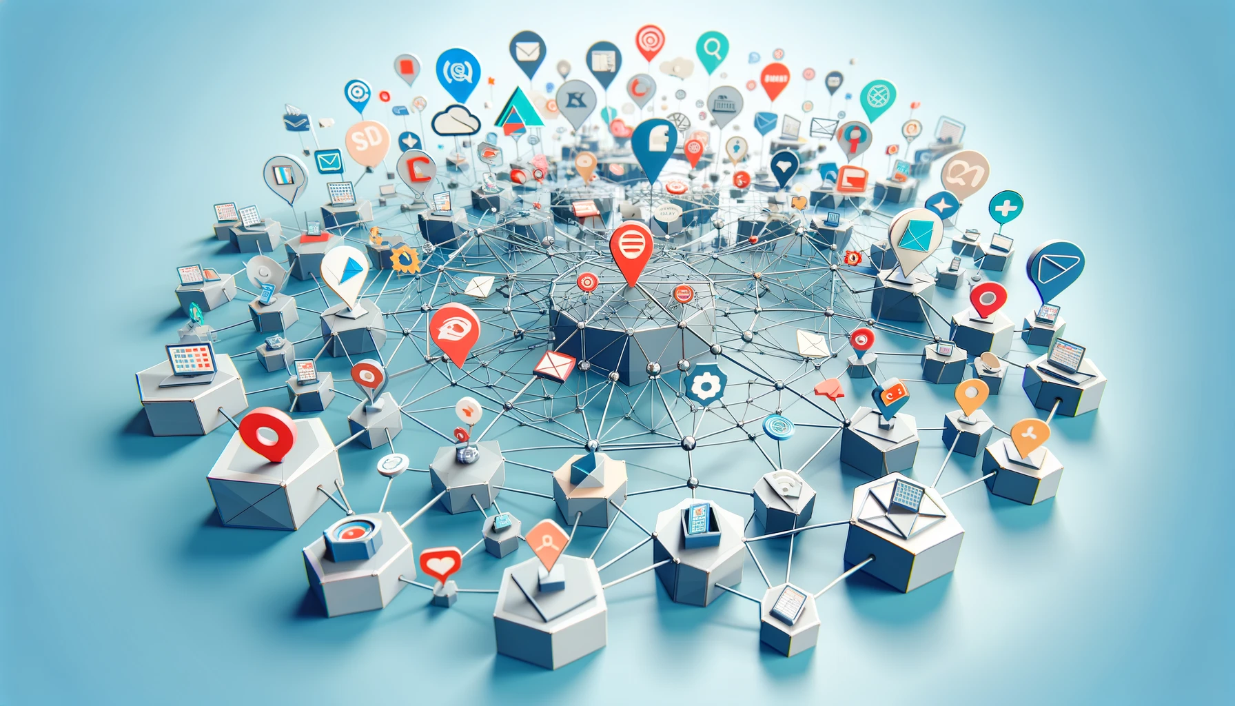 Artistic depiction of 'The Power of Omnichannel Marketing', featuring an array of interconnected geometric shapes symbolizing diverse marketing channels, harmoniously representing the seamless customer journey across multiple touchpoints, all portrayed in a low poly art style against a backdrop of clarity-inducing light blue.